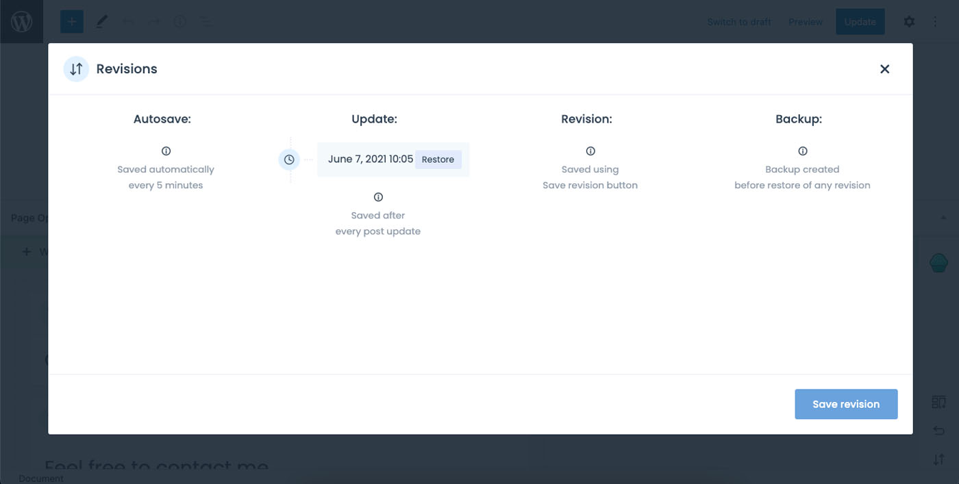 Thanks to Muffin Builder, you don’t have to reinvent the wheel. Your past revisions have been saved and you can simply go back in time by rolling back your portfolio site.