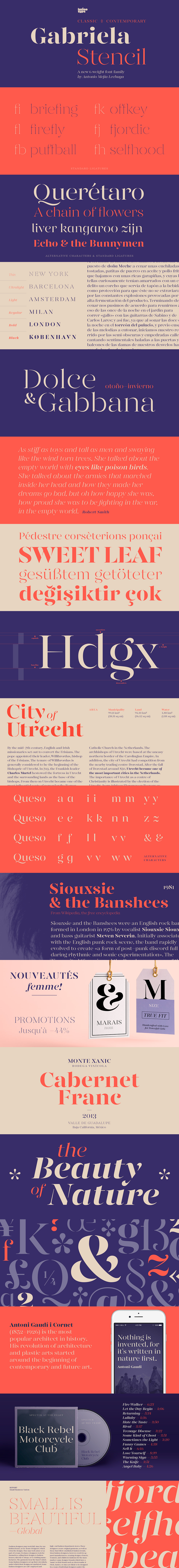 Gabriela Stencil is a classic font family with a unique character designed by Antonio Mejía Lechuga in collaboration with Latinotype Team. This font, well-suited for headlines, has features that emphasize its modern and elegant personality, inspired by the style of the 19th-century Didone typefaces.