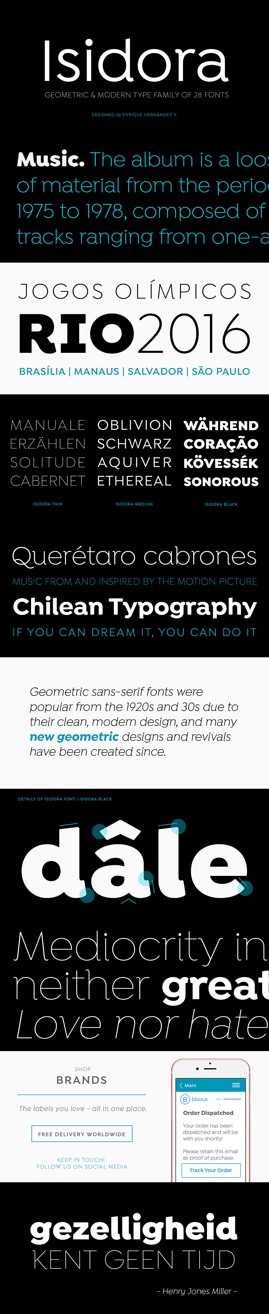 Designed by Enrique Hernández V, Isidora is a modern geometric font based on the classic typefaces of the early 20th Century yet with a contemporary and functional touch. In spite of its strong and rational structure, the font also looks friendly and expressive, thanks to its rounded terminals. In addition, its diagonal terminal cuts give it a softer and more rounded appearance.